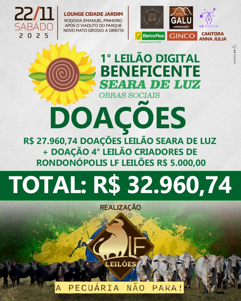 O agronegócio mato-grossense reafirmou sua vocação solidária com o encerramento do 1º Leilão Digital Beneficente Seara de Luz – Obras Sociais. Realizado no dia 22 de novembro no Lounge Cidade Jardim, em Cuiabá, o evento organizado pela LF Leilões superou as expectativas e atingiu a marca de R$ 32.960,74 em arrecadações totais. Os recursos serão destinados integralmente à manutenção das atividades da Seara de Luz, instituição que há 25 anos ampara crianças, idosos e famílias em situação de vulnerabilidade na capital.