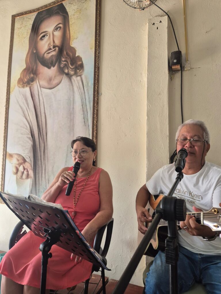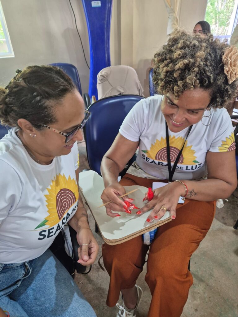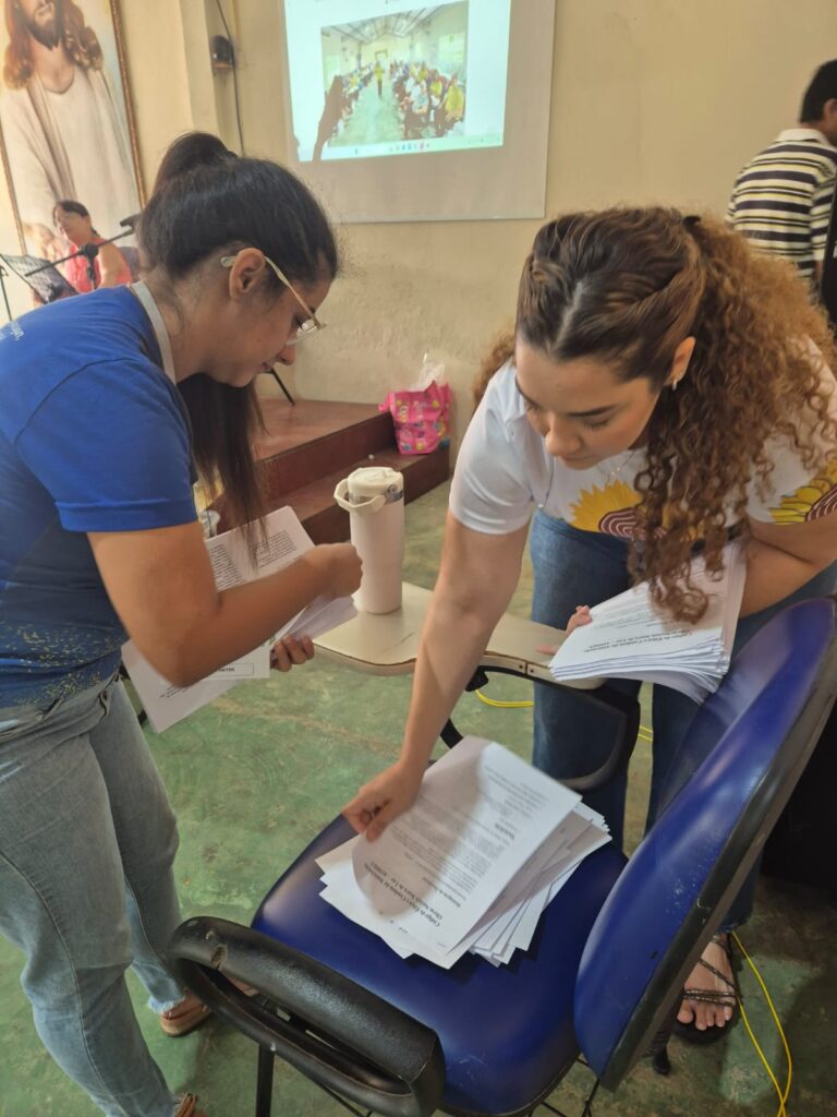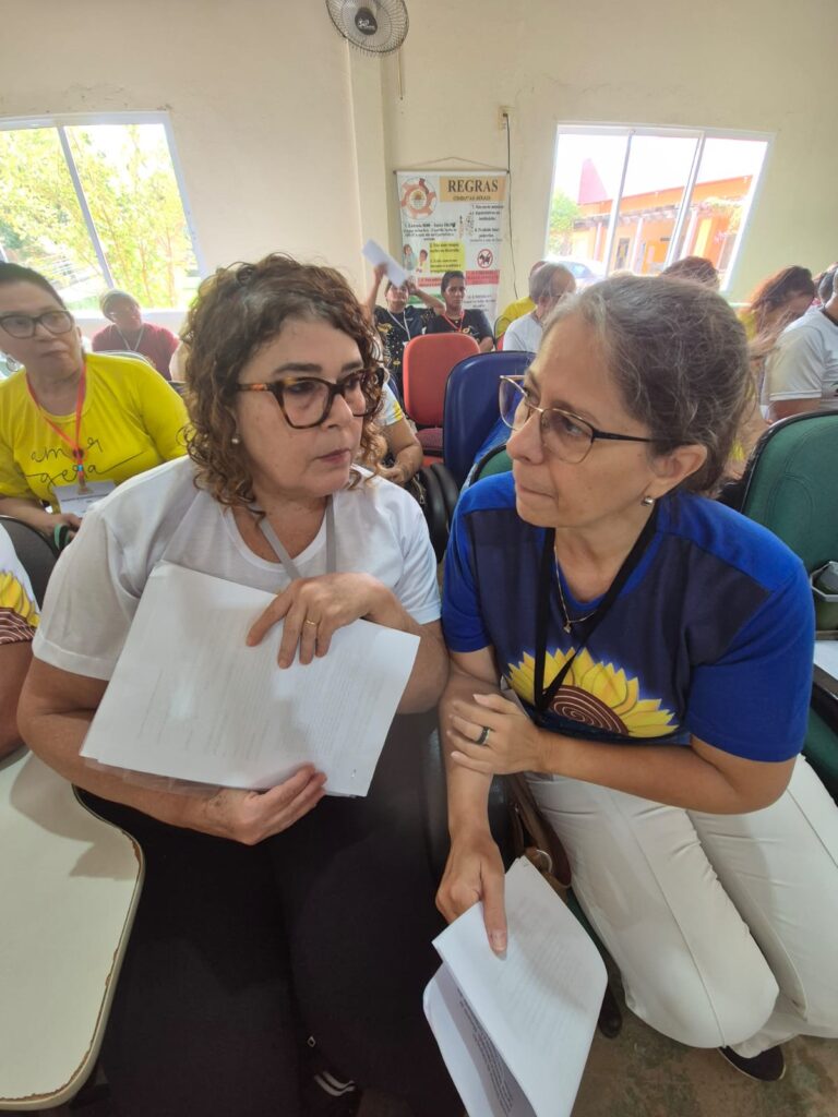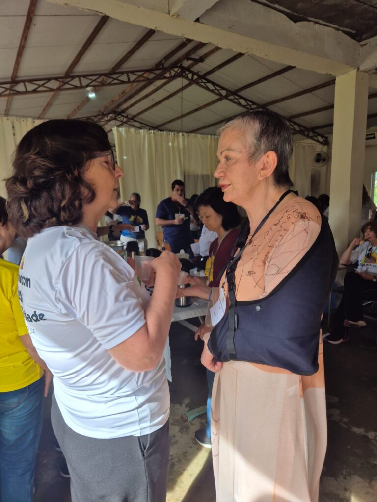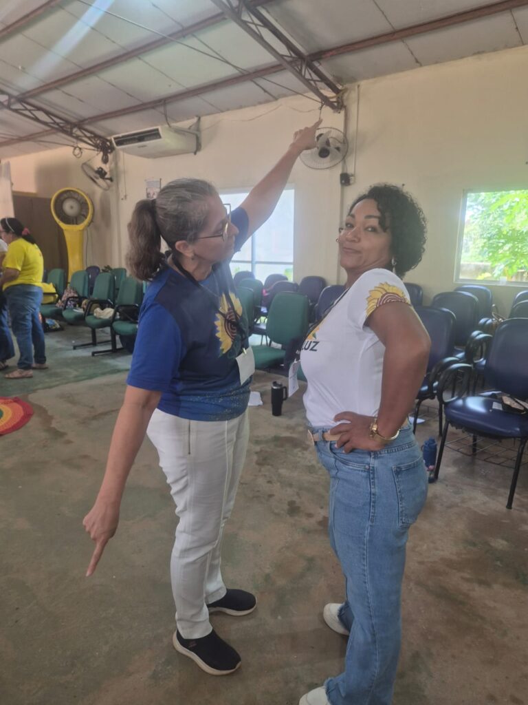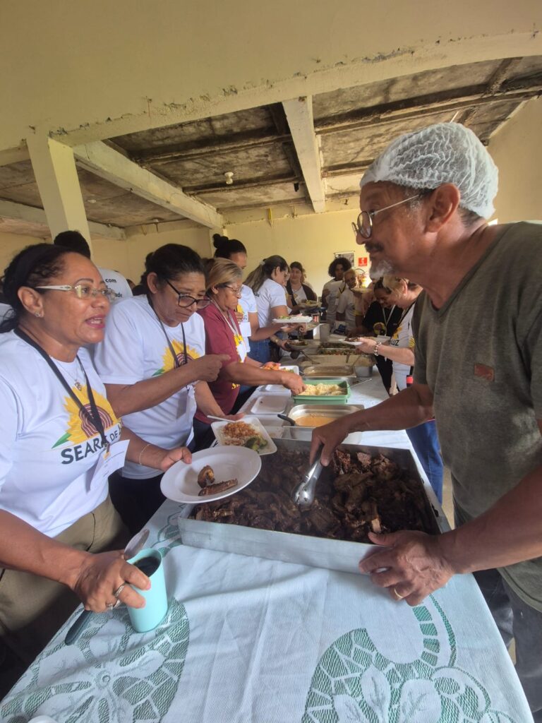 Integração: Antes do almoço musical, as voluntárias Luzia e Regina Oliveira conduziram uma dinâmica de valorização humana, essencial para manter o engajamento da equipe.