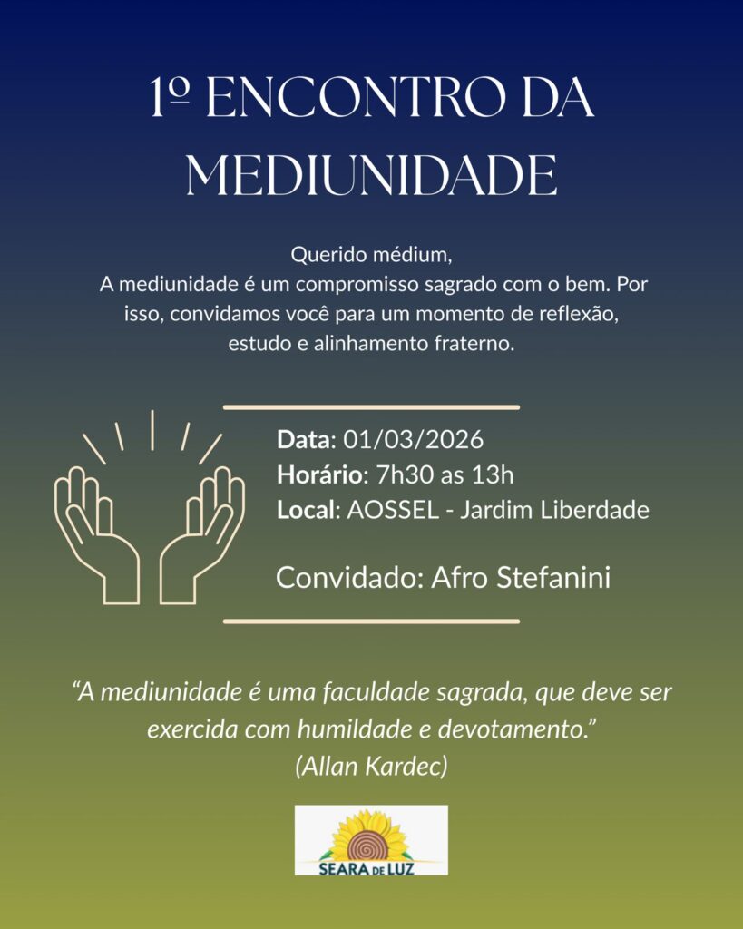 Com o objetivo de fortalecer os vínculos espirituais e reafirmar o compromisso com o auxílio ao próximo, a Seara de Luz realiza, no próximo domingo (01/03), o 1º Encontro da Mediunidade. O evento ocorrerá das 7h30 às 13h, na sede da AOSSEL, no Jardim Liberdade, reunindo médiuns trabalhadores para uma jornada de estudo e alinhamento doutrinário.